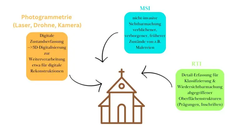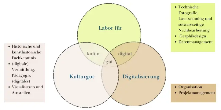 Als Team am Lehrstuhl bringen wir Expertise in den Bereichen Organisation (Projektplanung, -koordination und -management), historische und kunsthistorische Fachkenntnis, sowie technische Kompetenzen (u.a. technische Fotografie, Laserscanning) mit. Diese Kompetenzen münden in der (digitalen) Vermittlung und pädagogischen Begleitung, sowie in Visualisierungsprojekten und Ausstellungen.