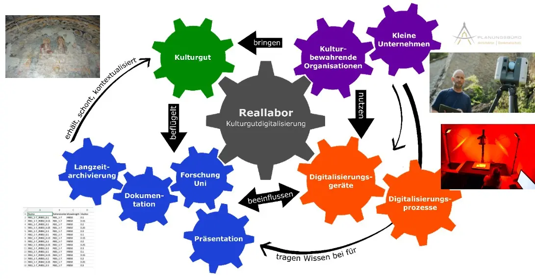 Dabei profitieren auch Forschung und Lehre. Kulturbewahrende Organisationen oder Personen bringen Kulturgüter und ihr Wissen um diese Artefakte mit ins Labor und bereichern dadurch die Objektvielfalt. Kleinere Unternehmen, die etwa bereits Erfahrungen in der Digitalisierung haben, bringen ihre Expertise und praktische Erfahrungen mit ein. So bieten wir Raum für einen lebendigen Austausch etwa zwischen Archivar:innen, Archäolog:innen, Museumsmitarbeiter:innen, Kunsthistoriker:innen, Historiker:innen, Architekt:innen, Techniker:innen und Informatiker:innen, um etwa die Dokumentation der Digitalisate und deren Langzeitarchivierung zu verbessern, also gemeinsam praxisnah zu forschen.
